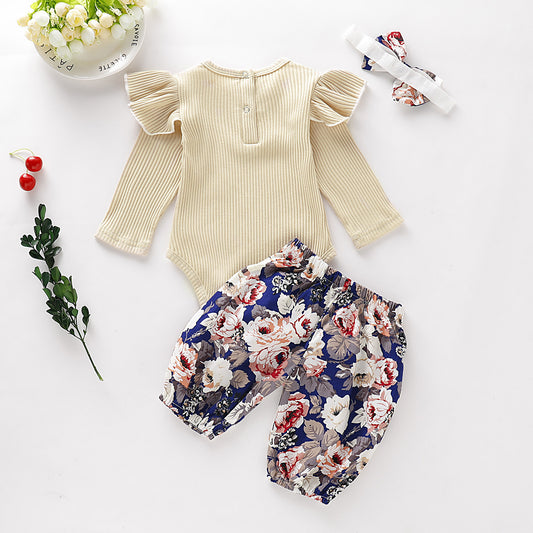 Grenzüberschreitendes Kinder Apricot Pit Strip Langarm-Blumenmuster-Hosen Dreiteiliges Set