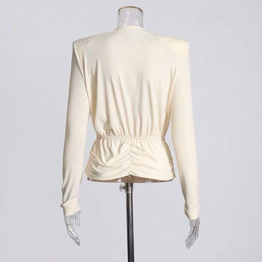 Top-modisches Shirt für Damen mit Schwingkragen, gepolsterten Schultern, Falten-Details und figurbetontem Schlankeffekt