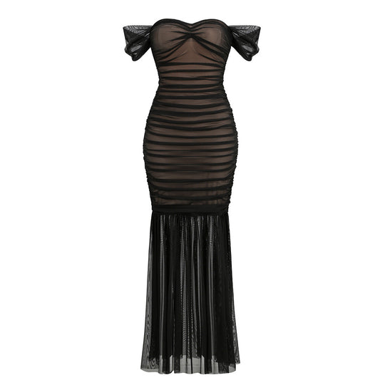 Off-Shoulder Röhrenoberteil Kleid mit Stitching, durchsichtigem Mesh und Falten, lang