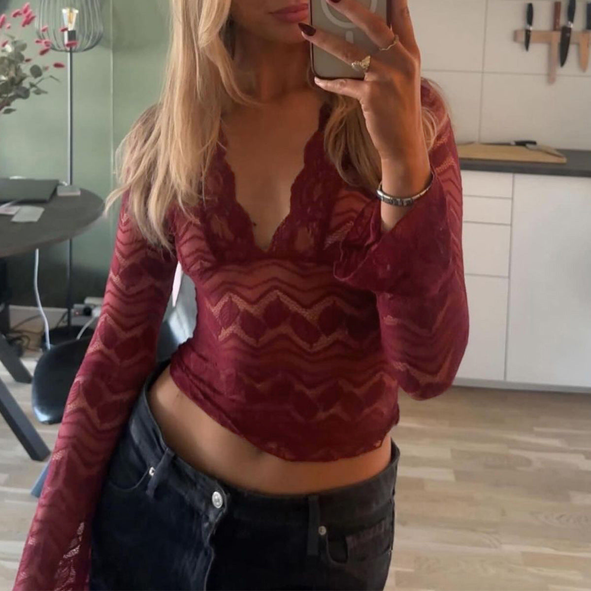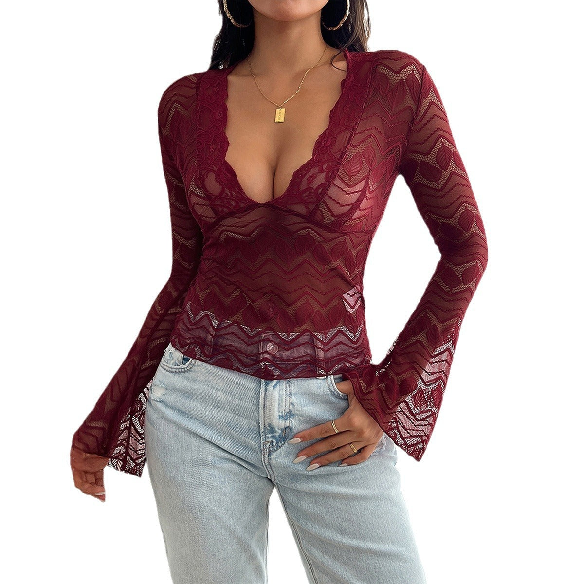 Damen Bell Ärmel hohl aus V-Ausschnitt Pullover Spitze Hemd Top