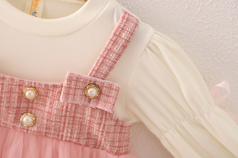 Mädchen Frühling und Herbst Neues Kleid Koreanischer Stil Modische Prinzessinnenkleid Fake-Zweiteiler-Trägerrock