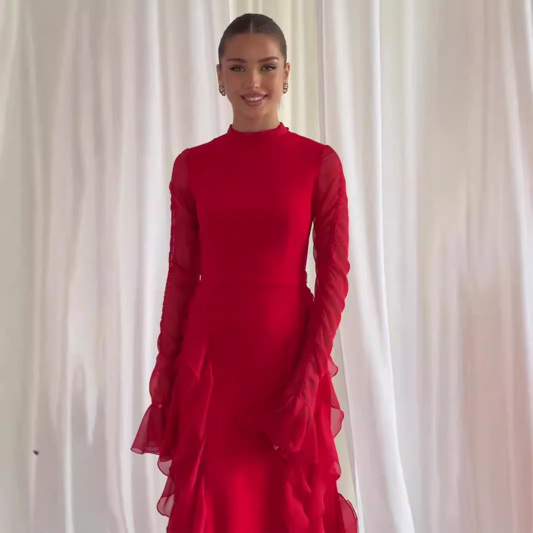 Rüschenshiffon-Patchwork-Kleid mit halbem Rollkragen